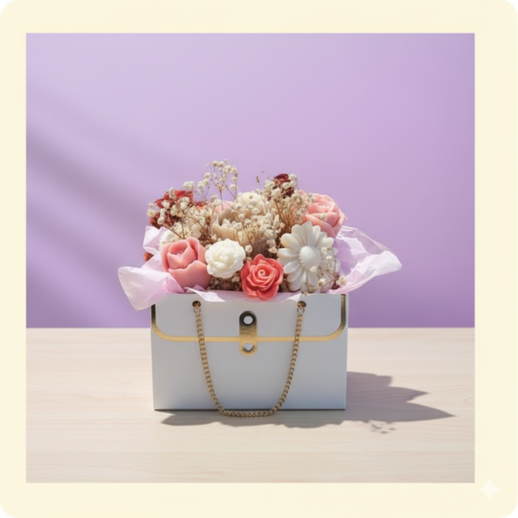 Bouquette artesanal con flores en cera dentro de una elegante cartera decorativa. El regalo ideal para destacar con estilo y creatividad.