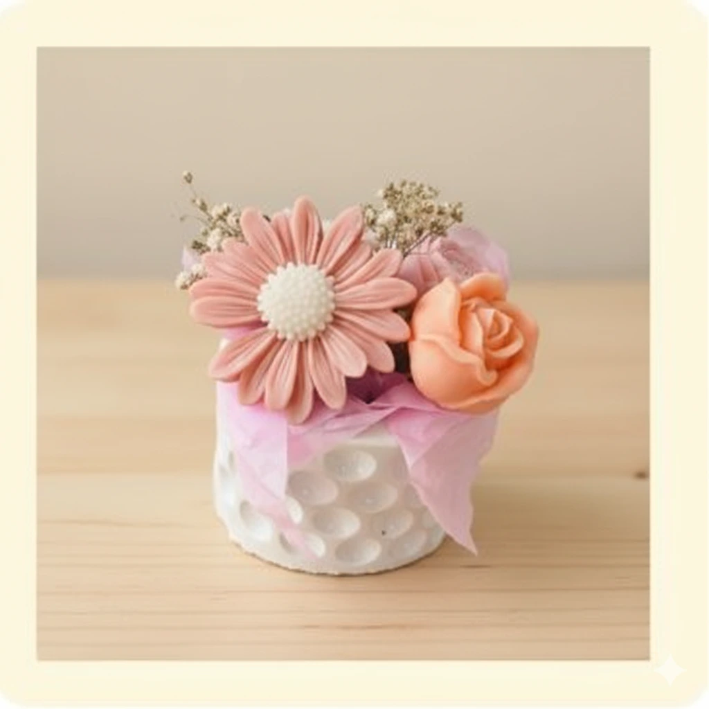 El Margot es un mini arreglo floral artesanal compuesto por 1 margarita y 3 flores pequeñas en cera, cuidadosamente elaboradas a mano.